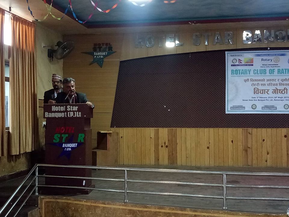 युवा जोश जागर भएका व्यक्तिहरुको सस्था रोटरी क्लब भएको भन्दै विकासका काममा साथ र सहयोगको अवाश्यकता रहेको बताउनु भयो । उहाले भन्नु भयो ‘शक्तिखोरदेखि सौराहासम्मको कयर खोलाको दुवै तर्फ ड्याम निर्माण गराएर बोटिङको व्यवस्था गर्नेगरी काम गर्नको लागि स्थानीय तहका प्रतिनिधिहरुलाई सुझाब दिनु भयो ।
