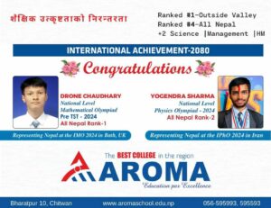 चितवन, २५ असार । अरोमा इङ्गलिस सेकेण्डरी स्कुलमा कक्षा १२ मा पढ्ने दुई विद्यार्थीहरू अन्तर्राष्ट्रिय स्तरको प्रतियोगितामा सहभागी हुने भएका